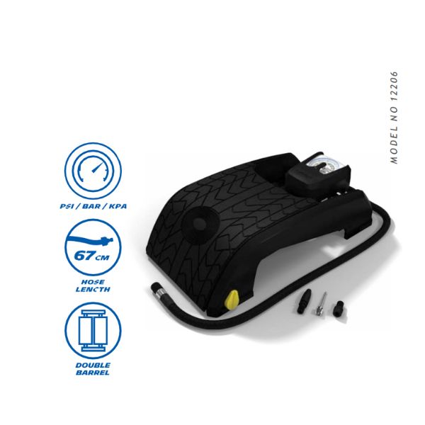 This durable analogue foot pump features a precision gauge accurate to ±1 PSI (up to 50 PSI), an ergonomic rubber tread plate, and a clear display in PSI, BAR, and kPa. Built with a wide steel frame and rubber feet for stability, it also includes snap-in adaptor storage for added convenience